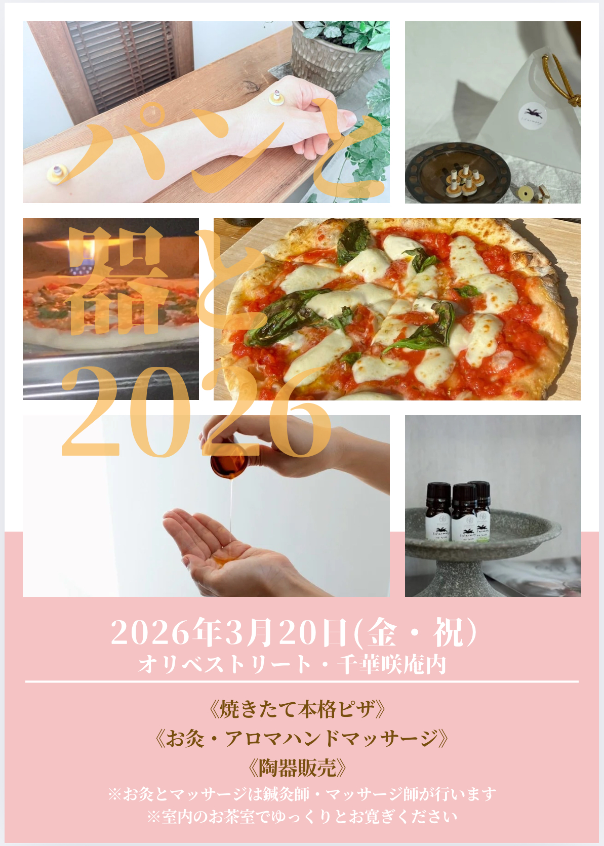 お身体を整えてイベントをめいいっぱいお楽しみ頂けますように、お灸とハンドアロママッサージをご提供致します。千華咲庵は室内もございますのでホッとひと休みにいらしてくださいね。今回初出店のBuonoさんの焼きたて本格ピザが食べられます‼︎オーガニックドリンクも是非ご一緒にどうぞ。