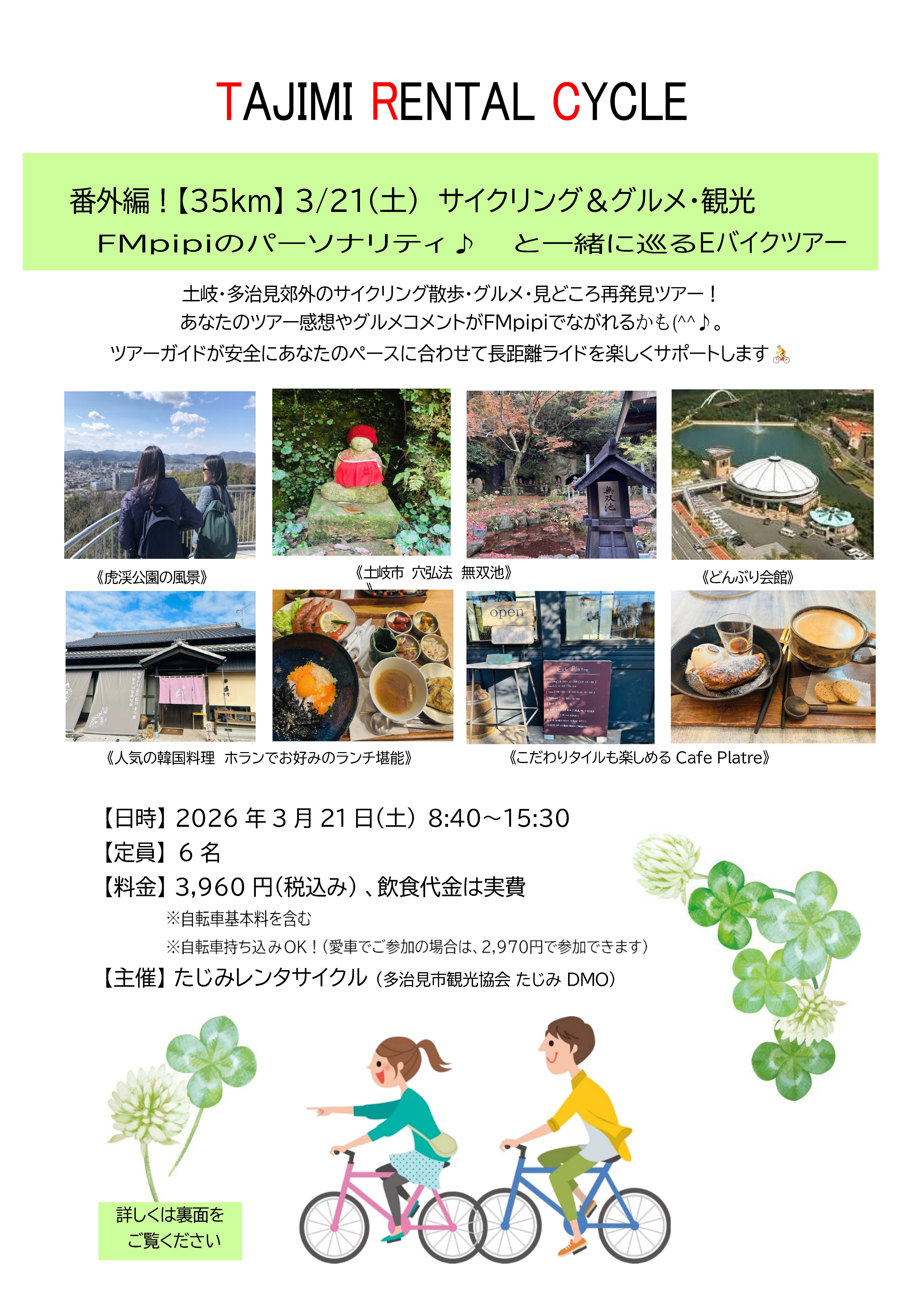 【ツアー詳細】 ※8:30 駅北立体駐車場 集合 ※飲食代金は実費になります。 【往路18km】 8:40 多治見駅北口(たじみレンタサイクル)~上野町~※「虎渓公園」~国道19号~「イオンモール土岐」~ 「土岐プレミアム・アウトレット」~土岐津町~下街道~※「穴弘法」~下街道~ 浅野~肥田町~※「稚児岩」 ~ 杉焼池~※「道の駅どんぶり会館」~「県道66号」東濃なんじゃもんじゃ街道~陶史台~ ※「韓国料理ホラン」(ランチコース1,600円~各種) 《食事・50min》 ※「人気の韓国料理ホランでお好みのランチを堪能しましょう! 【復路17km】 12:30 「韓国料理ホラン」~旧駄知線~下石橋~県道肥田下石線~「核融合科学研究所』~滝呂台~ ※「Cafe Platre」~グラウンド~坂上~多治見市役所~銀座通り~多治見橋~ながせ通り~多治見駅北口 《Cafe Platreでくつろぎ&スイーツtime ・50min》 15:30 (たじみレンタサイクル)到着